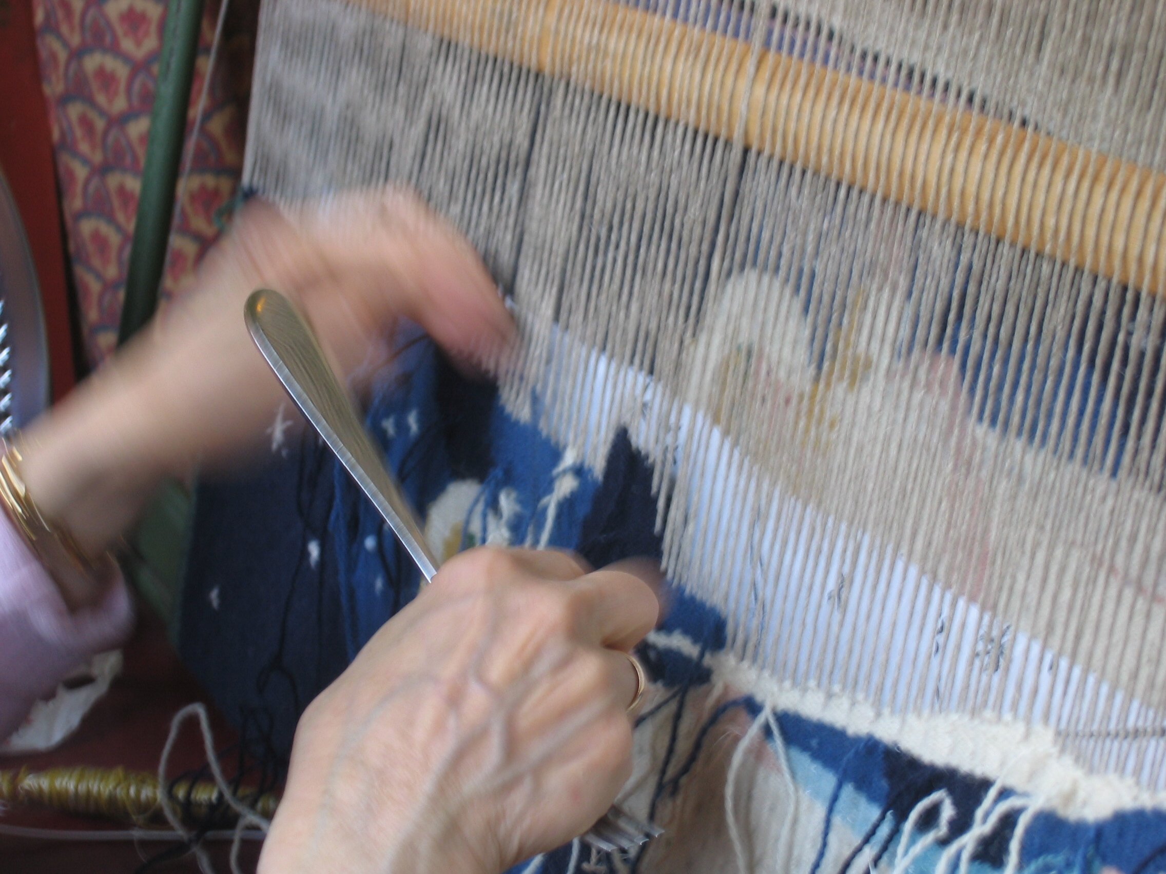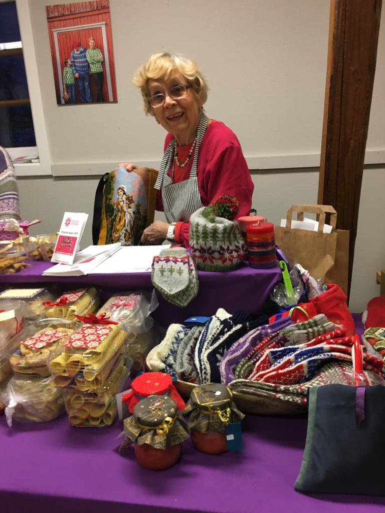 About My name is Randi Austenaa and I am an expert at needlework. Here on this site my son Jon presents some of my work. Me working on a tapestry named Milky Way